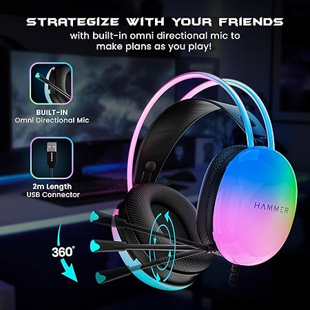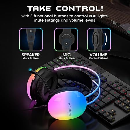 HAMMER Blaze Wired Over Ear Gaming Headphones with Mic, 50mm Drivers, Full RGB Lights, Gaming Headset with Adjustable Bands, Breathable earcushion, 1.5Mtr Wire with USB (Black)