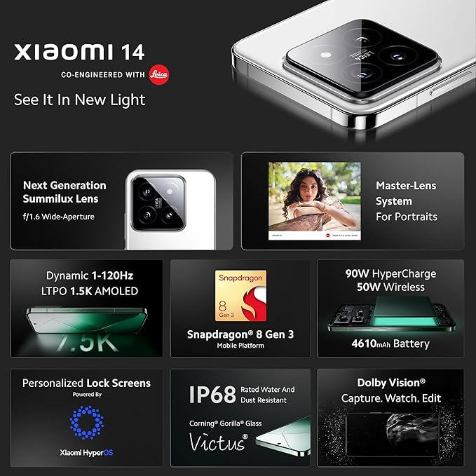 Xiaomi 14 (White, 12GB RAM, 512GB Storage) | 50MP Leica Professional Optics | 120 Hz 1.5K LTPO AMOLED | SD 8 Gen 3 Hyper OS
